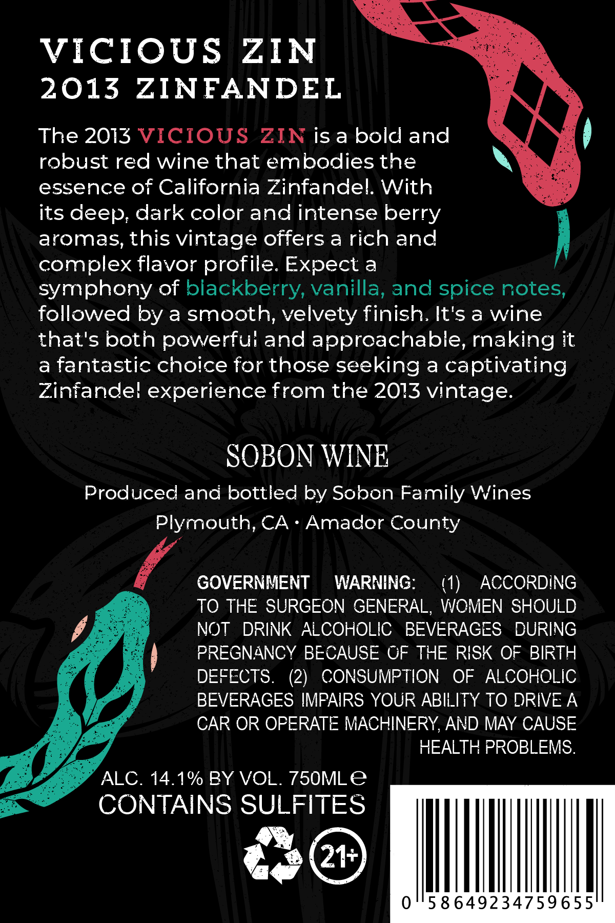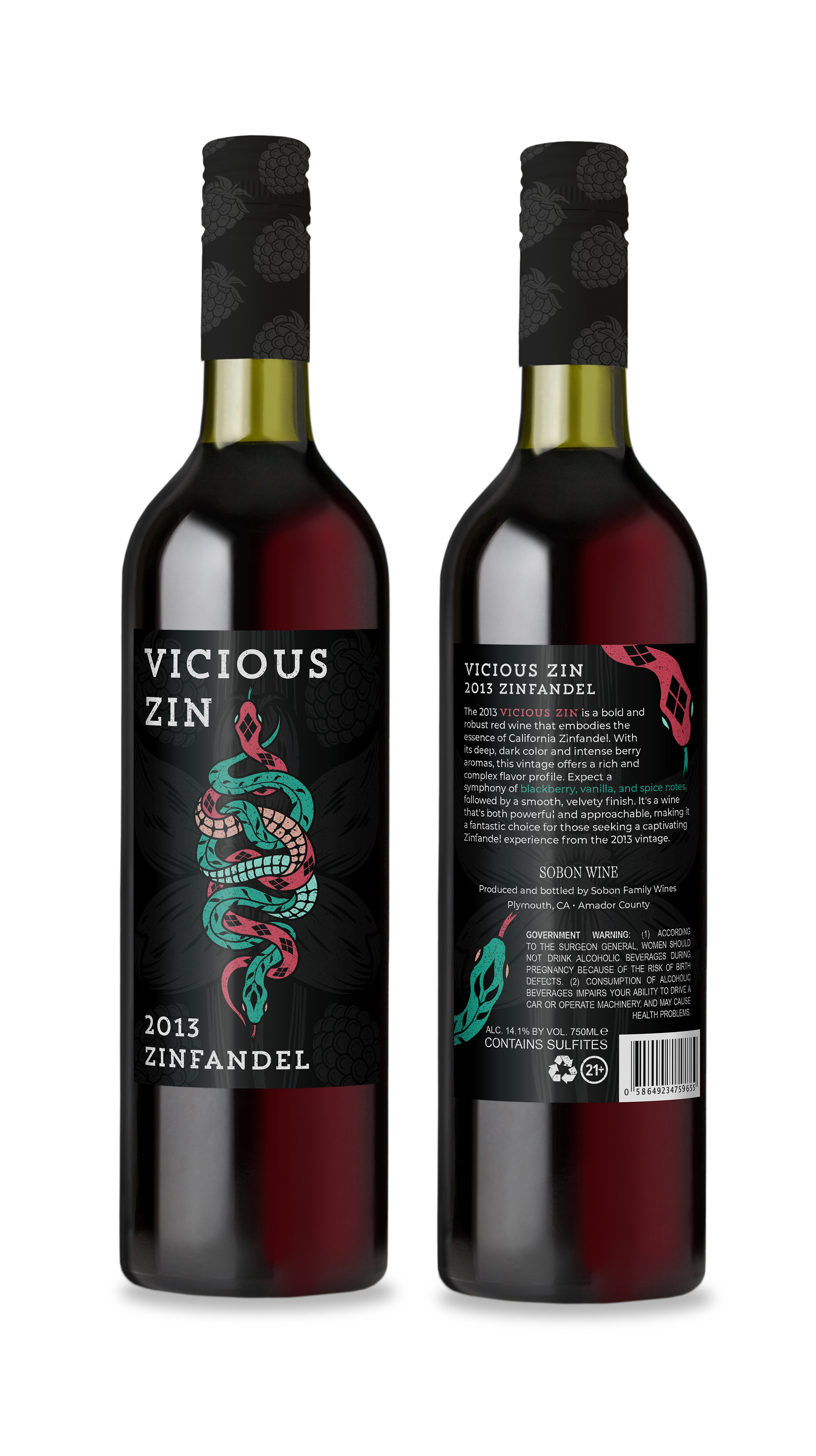 Vicious Zin is a red Zinfandel bottled in 2013 by Sobon Family Wines. The concept of the label is inspired by the vicious, poisonous snakes you can find in the state of California.